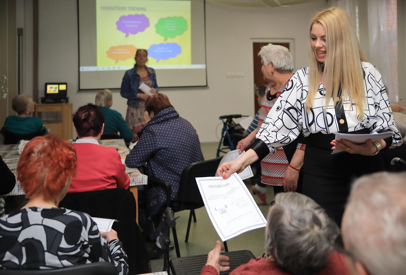 Klienti zariadenia mali možnosť aktívne sa zapojiť do kognitívneho tréningu, ktorý bol zameraný na krátkodobú pamäť, verbálne porozumenie, percepčné usporiadanie, kognitívnu pružnosť a flexibilitu. Jednotlivé písomné aktivity boli spestrené aj psychogymnastickými a pohybovými aktivitami, ktoré klienti ocenili s úsmevom a so záujmom ich absolvovali. V závere stretnutia všetci zúčastnení obdržali osvedčenie o účasti na danom podujatí.