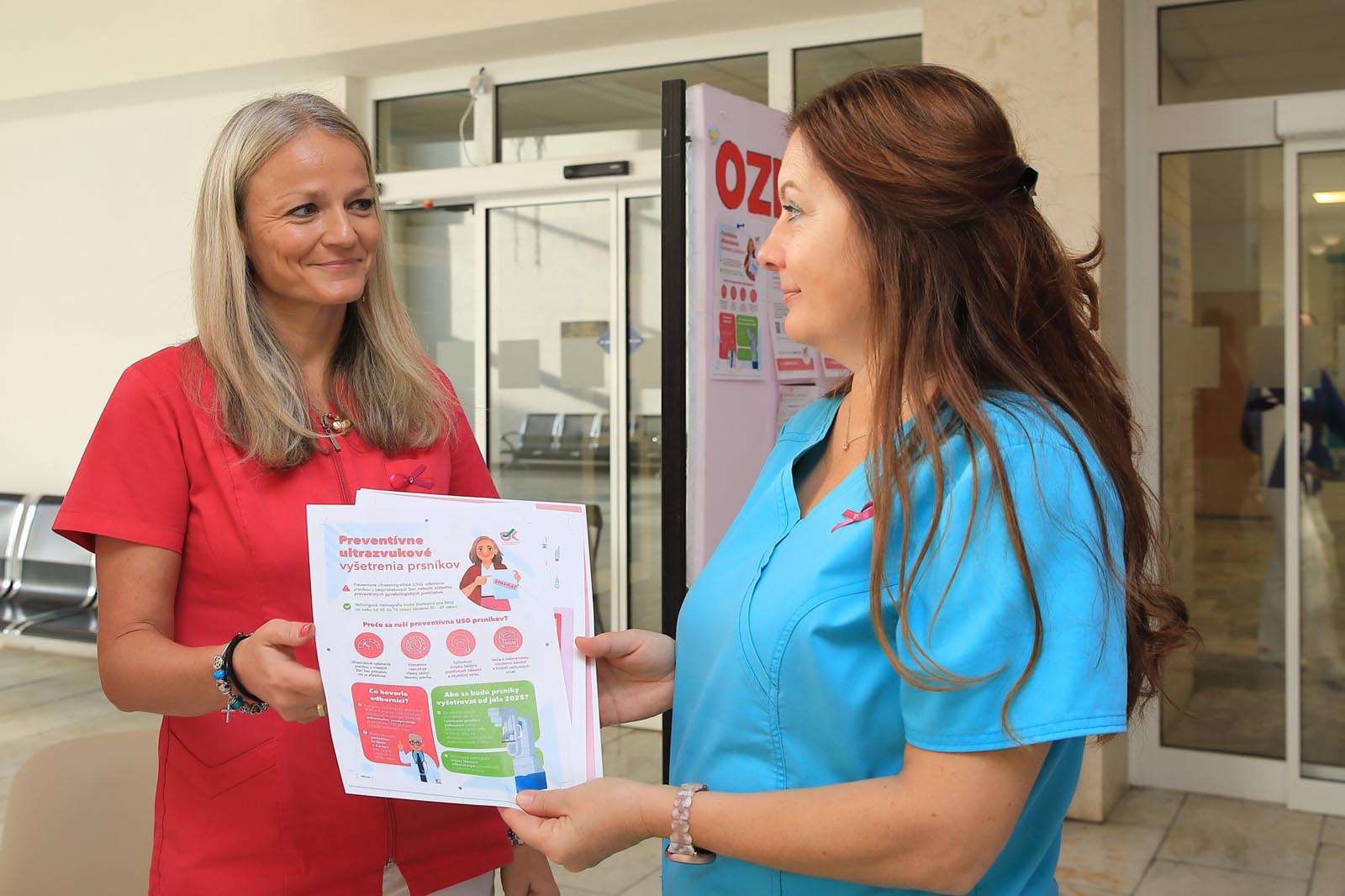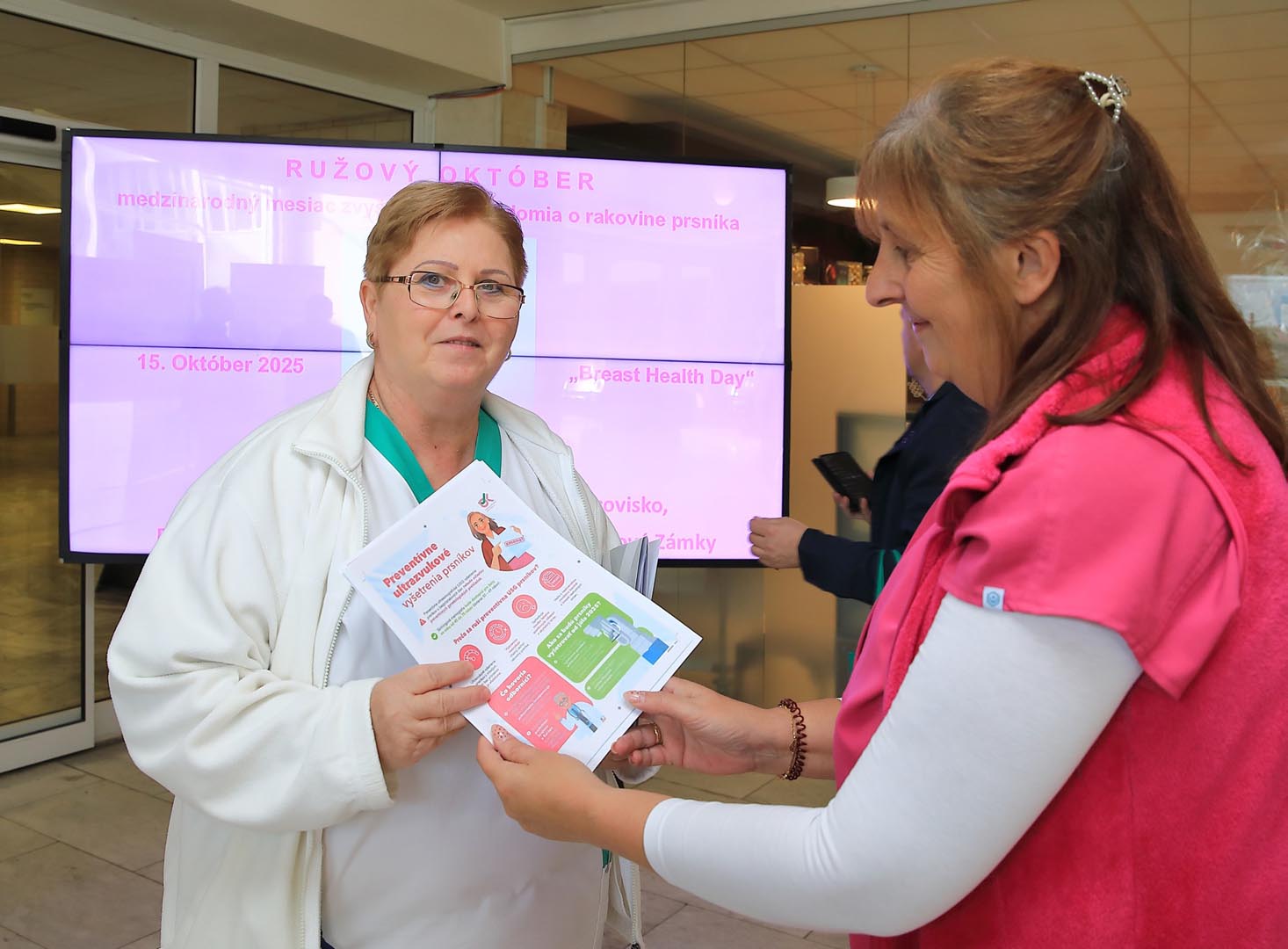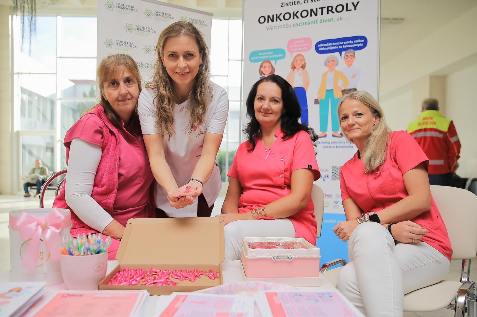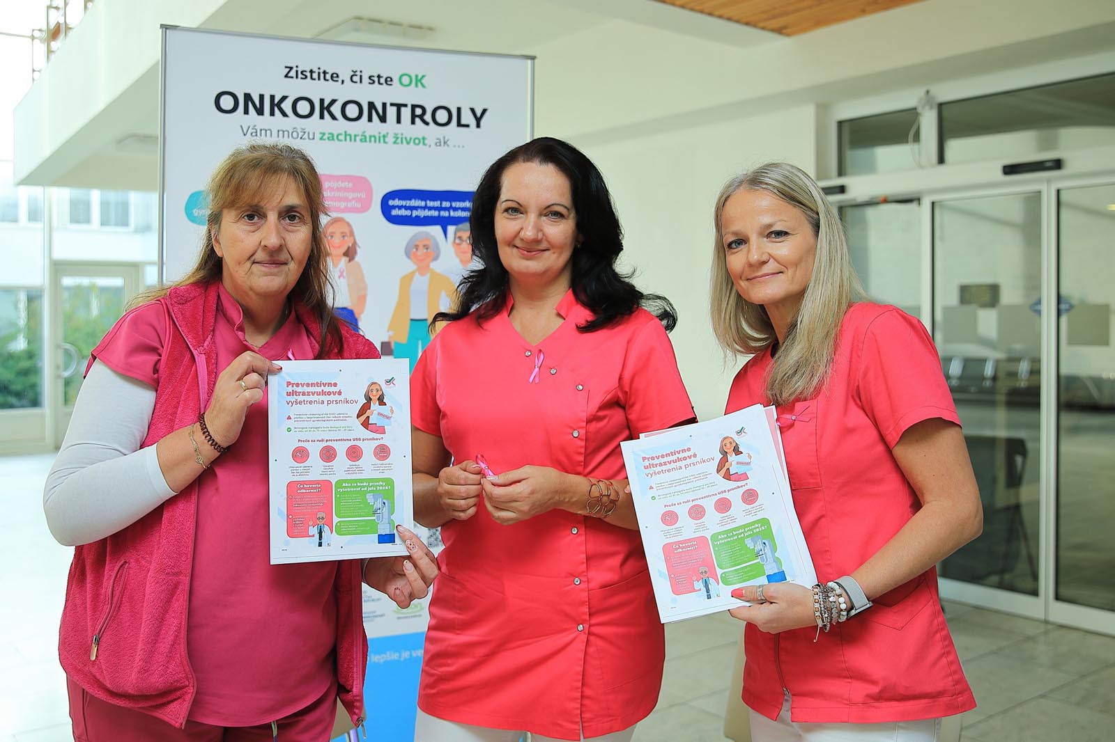 Vo vestibule monobloku pripravili rádiologické techničky ružovú osvetovú akciu, počas ktorej osobne informovali o význame samovyšetrovania prsníkov a sonografických vyšetrení. Zároveň pripínali ružovú stužku – ako symbol podpory, spolupatričnosti a prevencie.