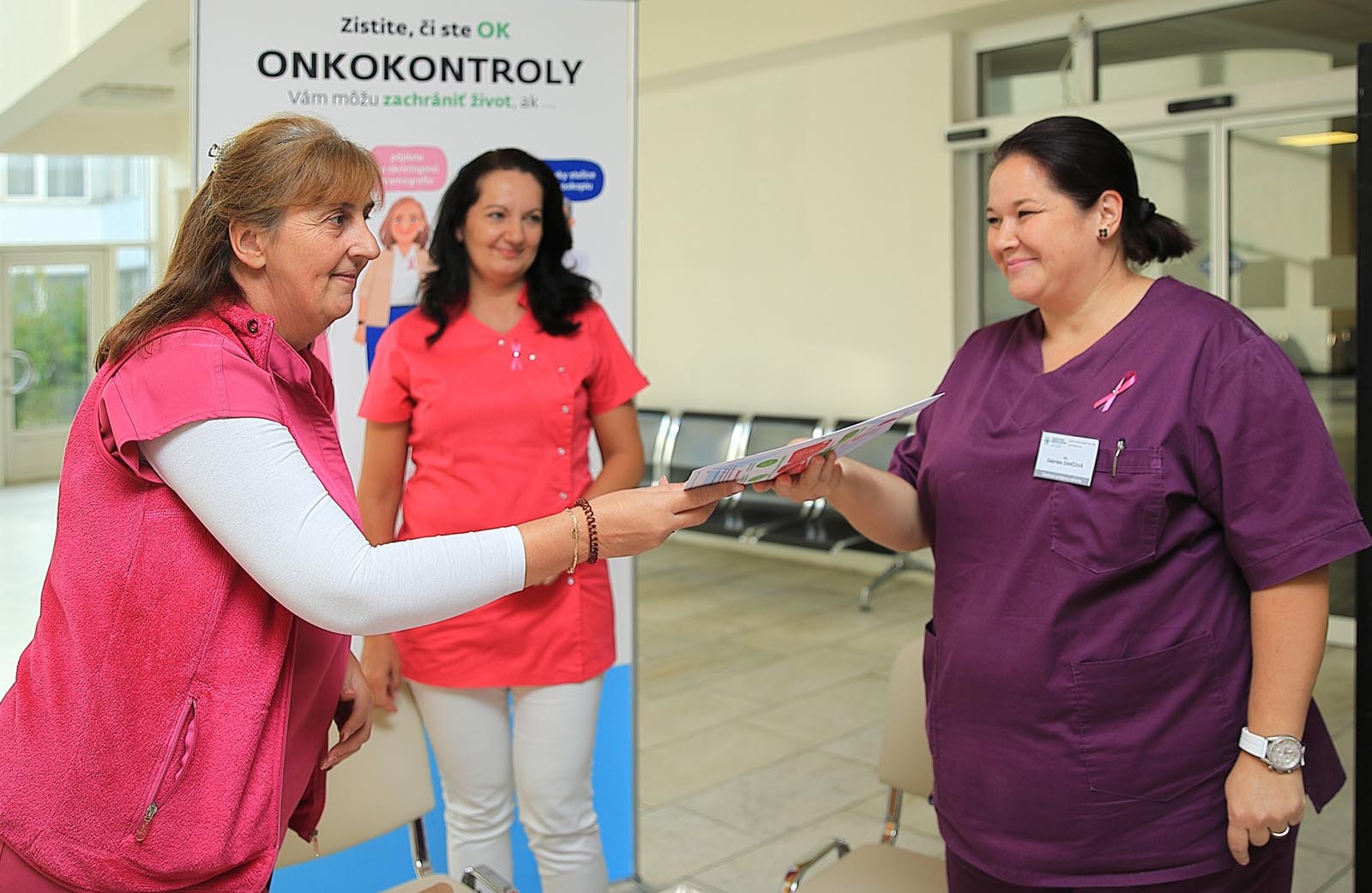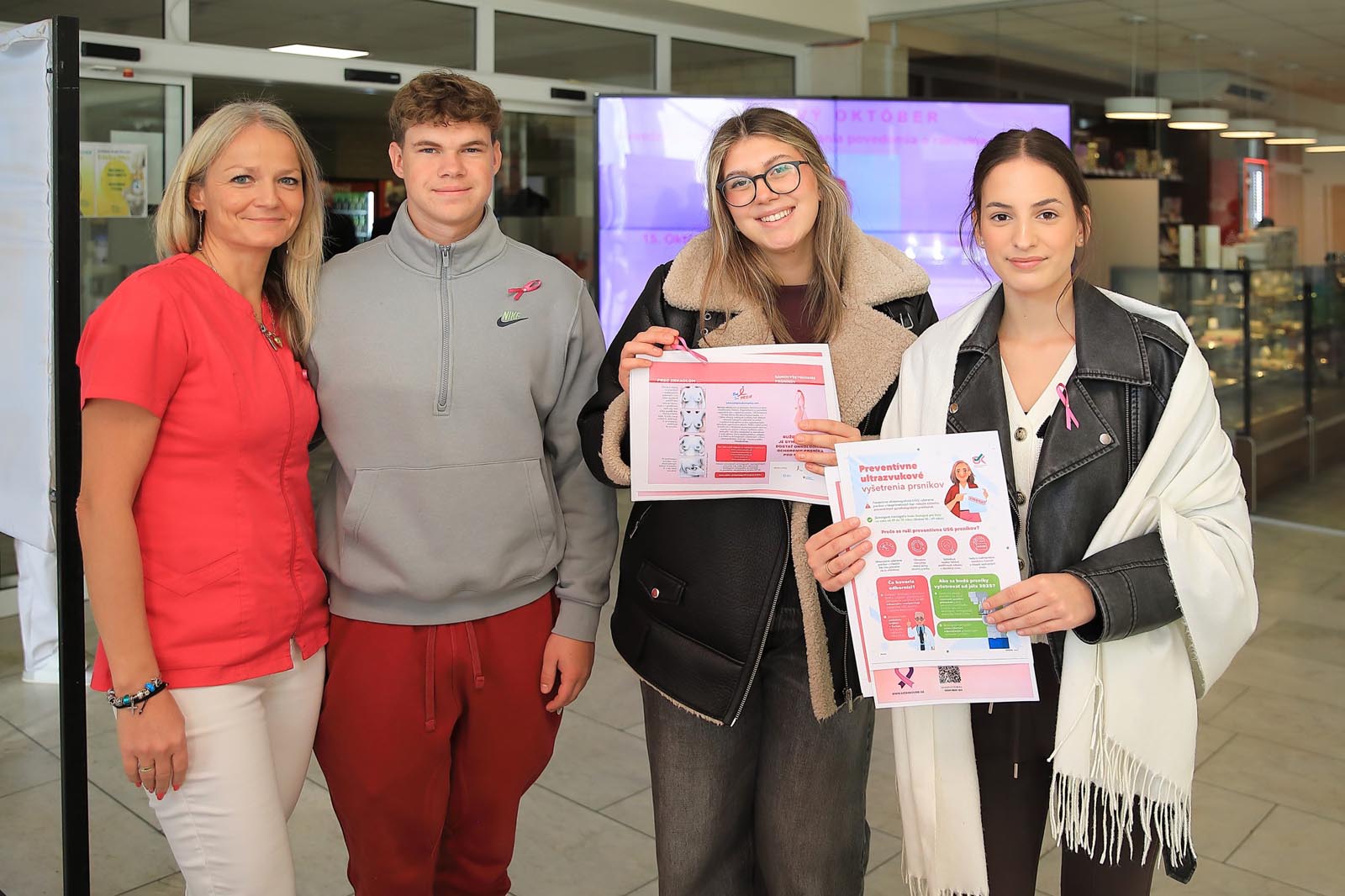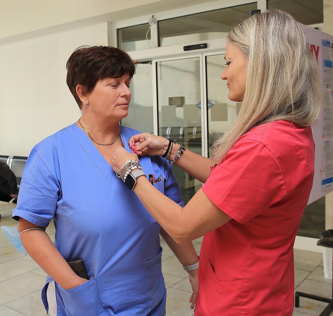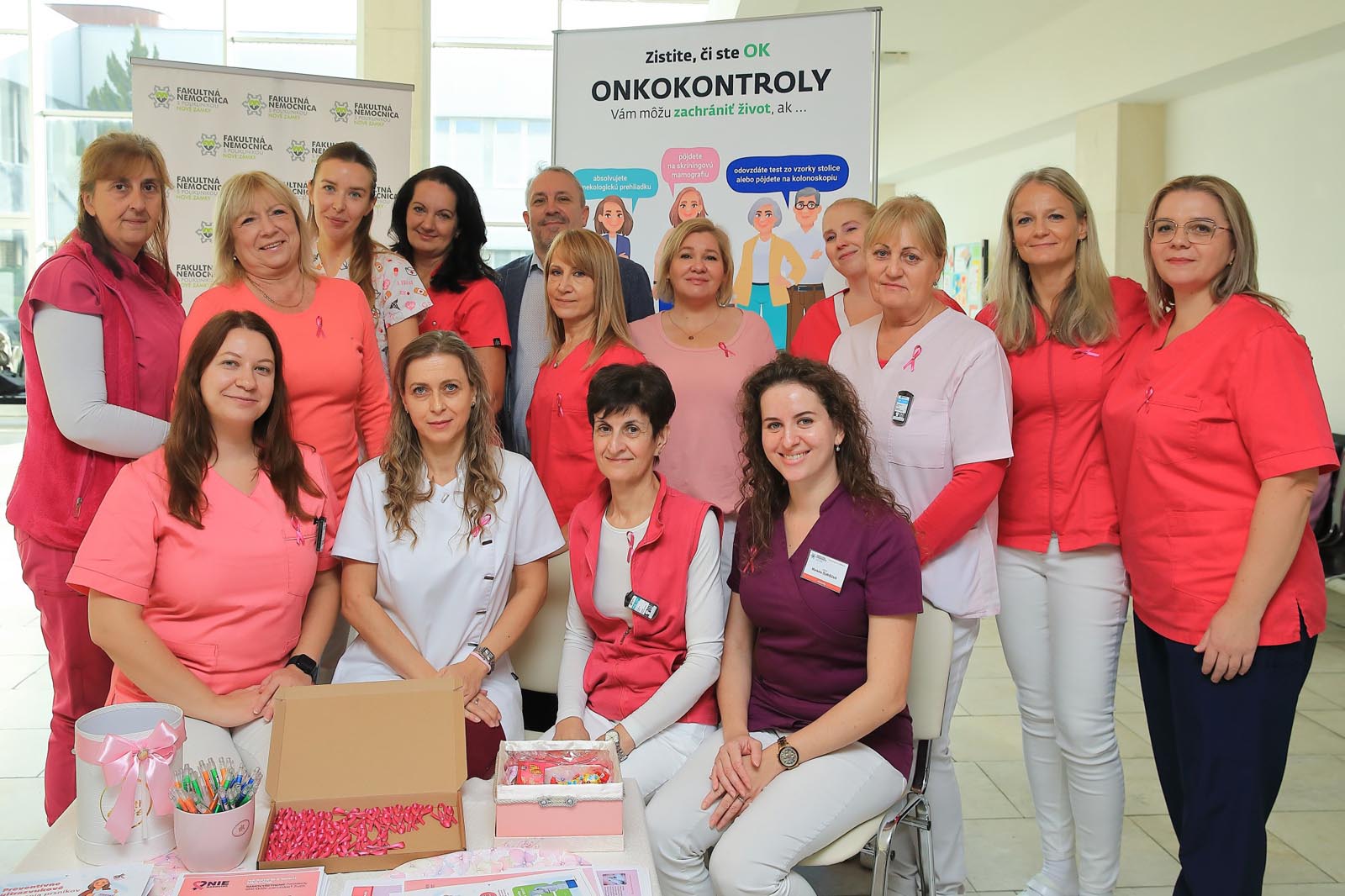 Vo vestibule monobloku pripravili rádiologické techničky ružovú osvetovú akciu, počas ktorej osobne informovali o význame samovyšetrovania prsníkov a sonografických vyšetrení. Zároveň pripínali ružovú stužku – ako symbol podpory, spolupatričnosti a prevencie.
