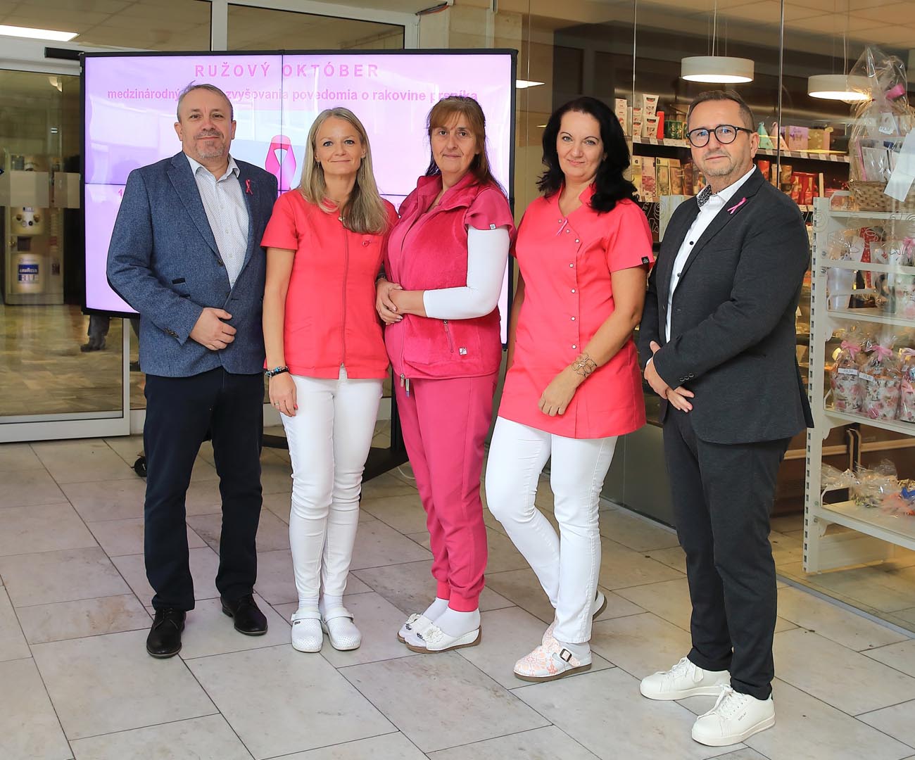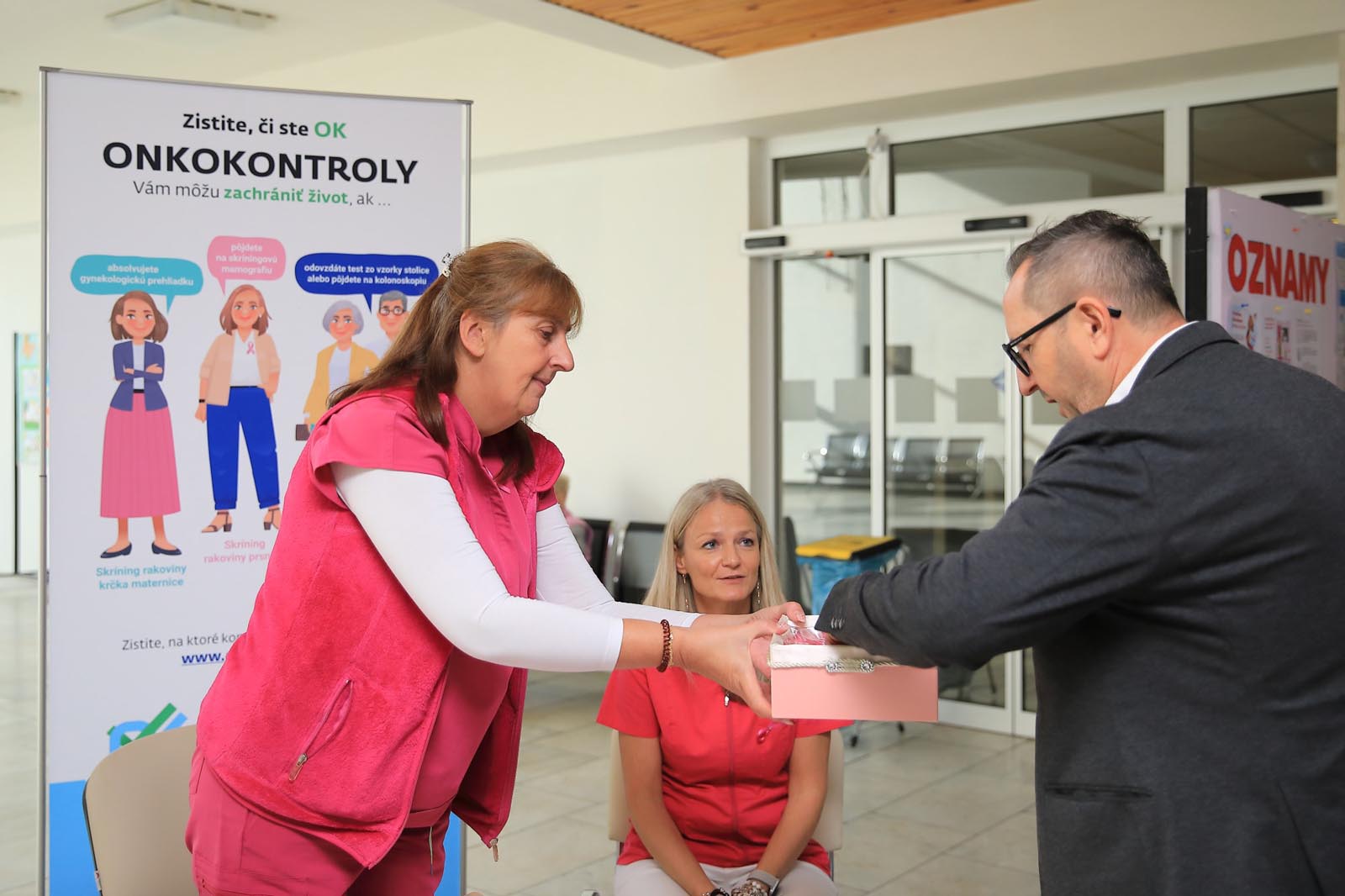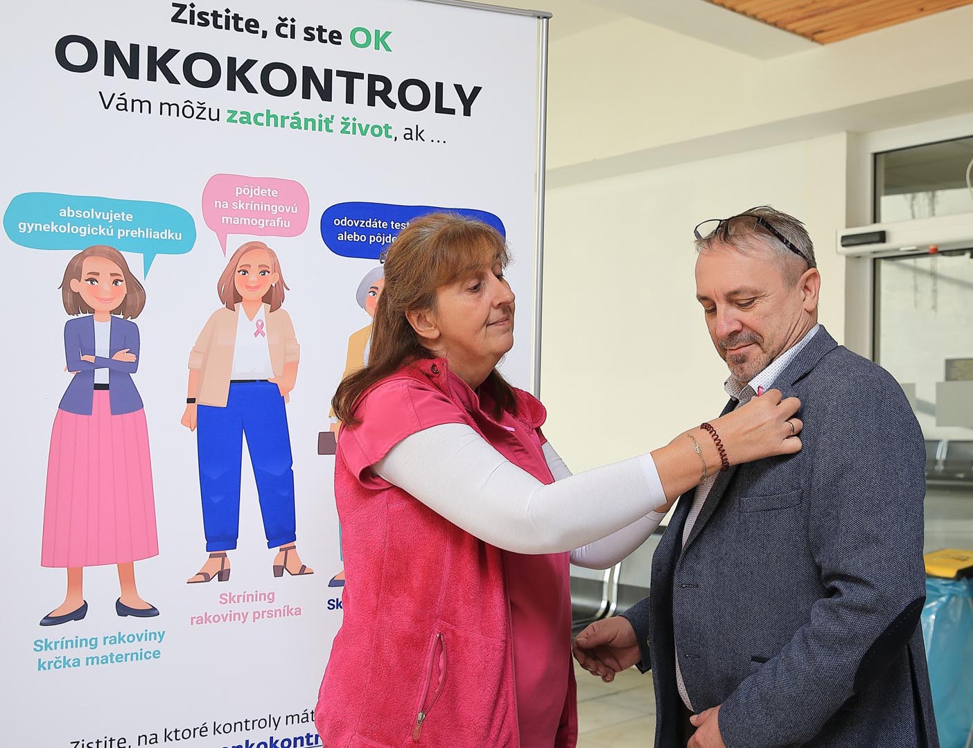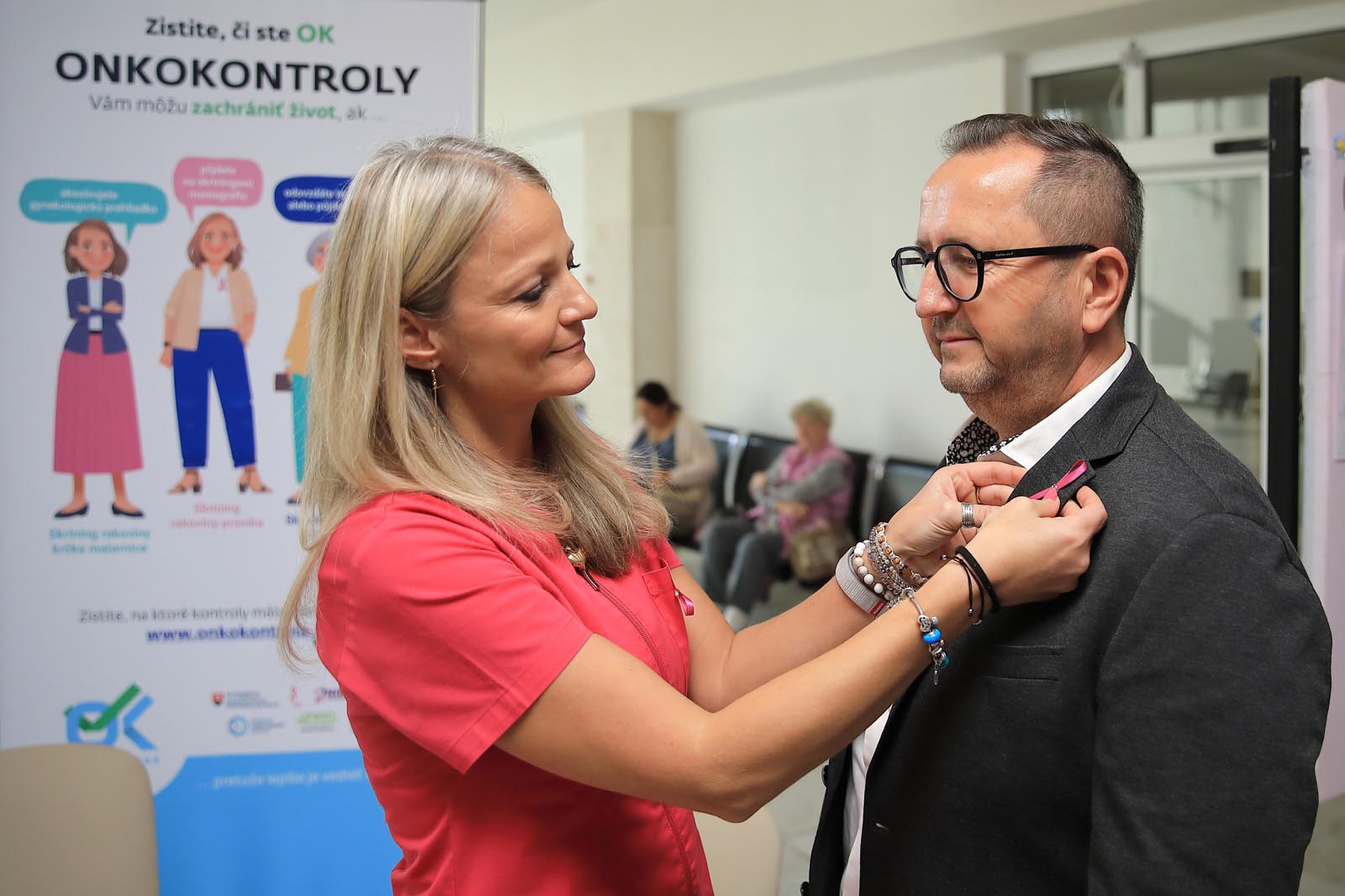 Vo vestibule monobloku pripravili rádiologické techničky ružovú osvetovú akciu, počas ktorej osobne informovali o význame samovyšetrovania prsníkov a sonografických vyšetrení. Zároveň pripínali ružovú stužku – ako symbol podpory, spolupatričnosti a prevencie.