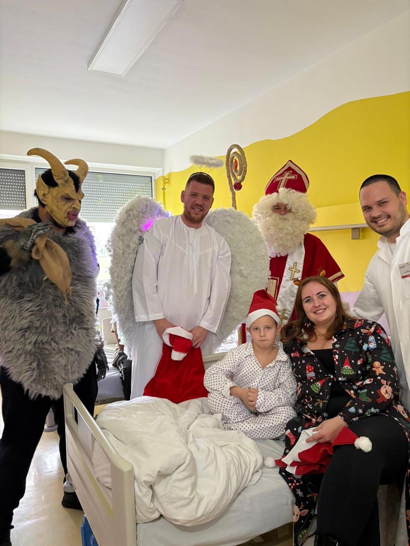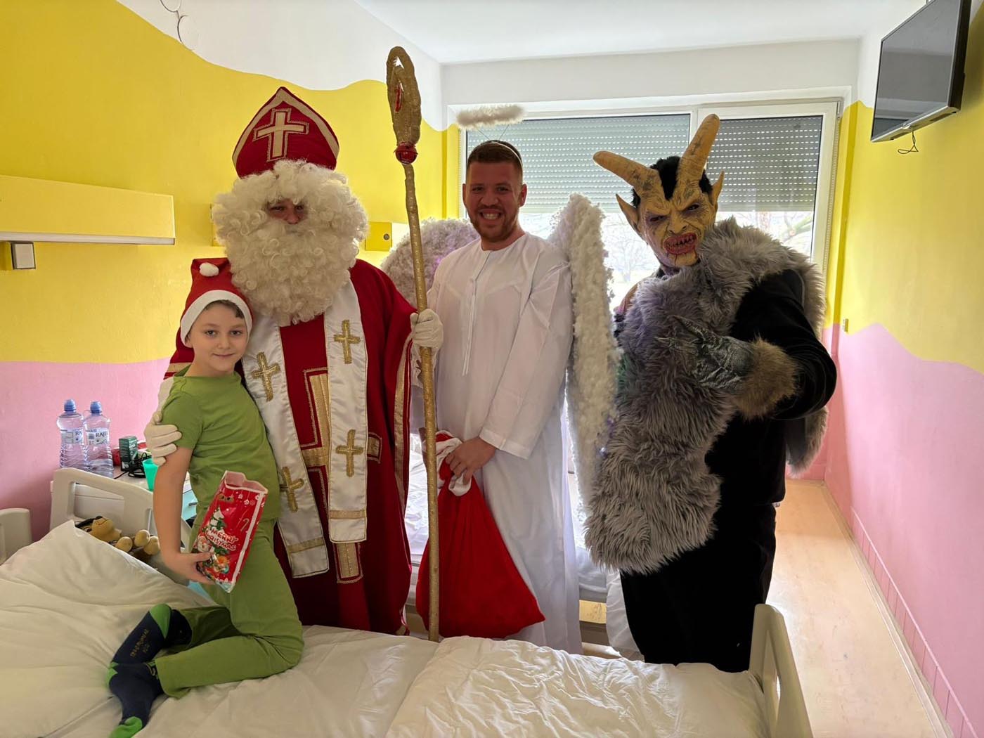 V sobotu sa Mikulášska návšteva sústredila na Pediatrickú kliniku, kde deti osobne potešili dobrovoľníci Roman Valkovič, Marek Kóša a Kristián Kóša. V úlohách Mikuláša, čerta a anjelika navštívili malé aj väčšie deti, rozdávali darčeky a vyčarili úsmevy nielen pacientom, ale aj celému personálu kliniky.