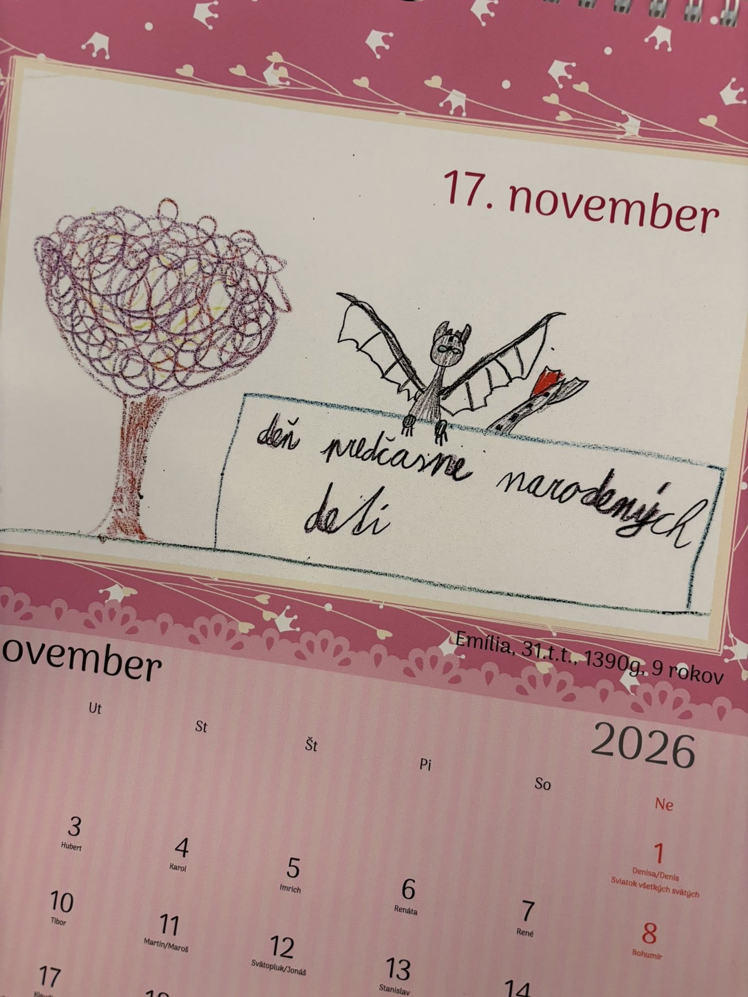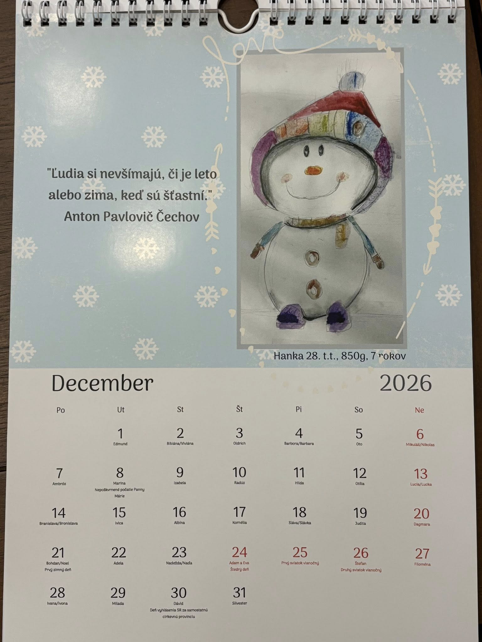 Kalendár malých umelcov 2026 z Neonatologickej kliniky FNsP Nové Zámky nie je len kalendár. Je to príbeh odvahy, nádeje a lásky – vyrozprávaný kresbičkami predčasne narodených detí, našich malých veľkých bojovníkov.