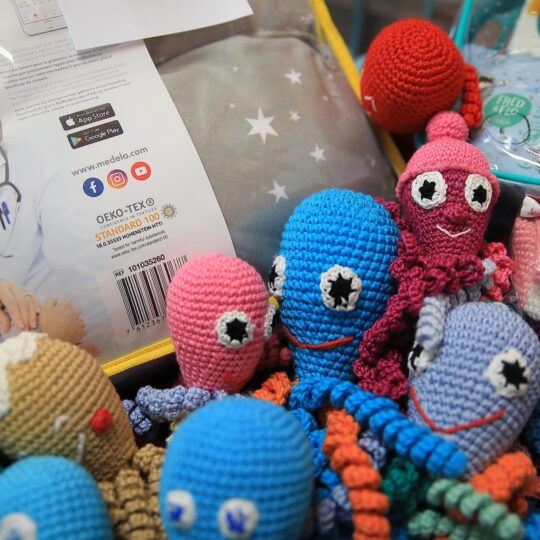 Balíčky prišli aj od klientov Zariadenia sociálnych služieb Sympathy n. o. z Jasovej. Už v októbri ich doručili úhľadne zabalené. Sympatické seniorky uháčkovali pre predčasne narodené bábätká nádherné usmievavé chobotničky, ktoré potešia nejedného drobčeka v inkubátore, keď bude jeho drobná rúčka hľadať, čo by mohla uchopiť. A títo malí bojovníci veru radi nájdu každú hadičku, napríklad tú, ktorá im pomáha dostať mlieko do bruška a snažia sa ju vytiahnuť. Chobotničky sú preto nielen potešením pre dieťatko, ale aj pomocou pri starostlivosti oň.