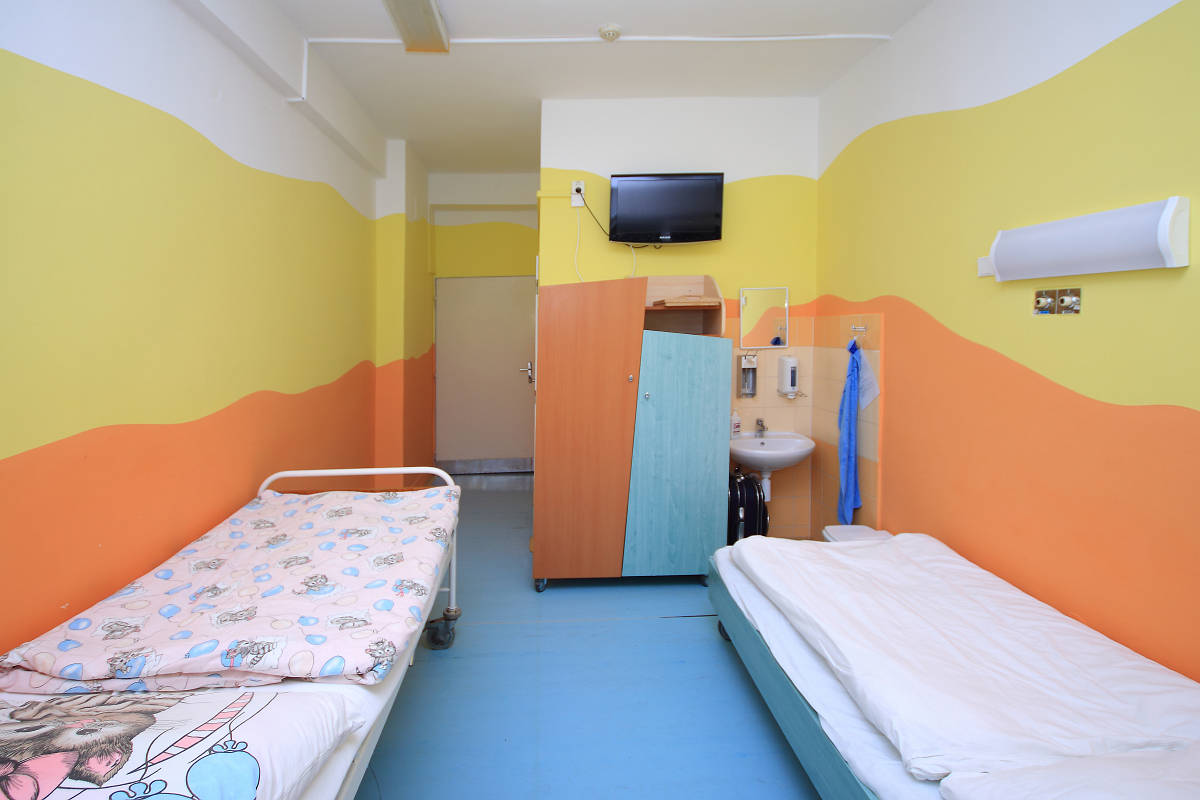 Izolačná izba na úseku malých detí: nábytok, lôžko, LCD televízor, chladnička, izba má samostatnú sprchu a WC.
